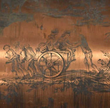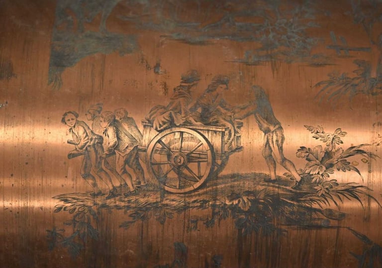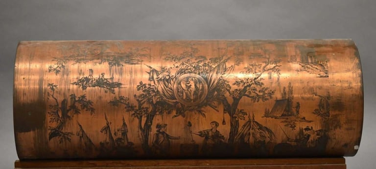 Réalisé en impression en creux sur cuivre, dite “à la manière d’Angoulême”, ce cylindre illustre une technique dérivée de la gravure d’estampe, permettant une impression continue du tissu et une grande finesse de dessin. Avec cette acquisition, l’Association des Amis du Musée de la Toile de Jouy documente la longue vie des motifs de Jouy, depuis leur création au XVIIIᵉ siècle jusqu’à leurs réemplois industriels, et éclaire concrètement les étapes de fabrication de la Toile de Jouy, du dessin au tissu imprimé.